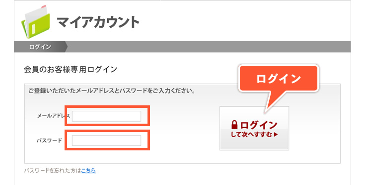 マイページにアクセスし、「メールアドレス」「パスワード」を入力し、ログイン!