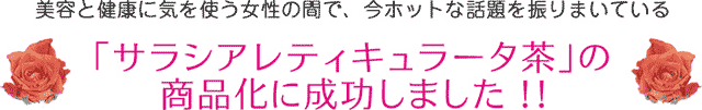 「お茶を飲むだけでスリムになれるわけない。」と思っているあなたに是非試していただきたい。 「サラシアレティキュラータってくせがある。」と思っているあなたにも、自信を持ってお届けいたします。美容と健康に気を使う女性の間で、今ホットな話題を振りまいている「サラシアレティキュラータ茶」です。